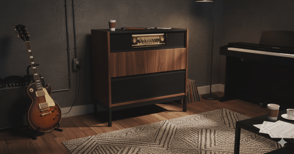 Remarquable par sa taille et ses finitions raffinées, GASTON est un meuble design, inspiré des consoles des années 60. Vous choisissez les matériaux – bois, carbone, plastique – et des couleurs – rouge, bleu,vert, noir, gris – plus de 80 finitions possibles la finition plus ou moins satinée. Boutons en aluminium brossé et plaqué or brillant. Un espace rangement éclairé permet de ranger vos vinyles.